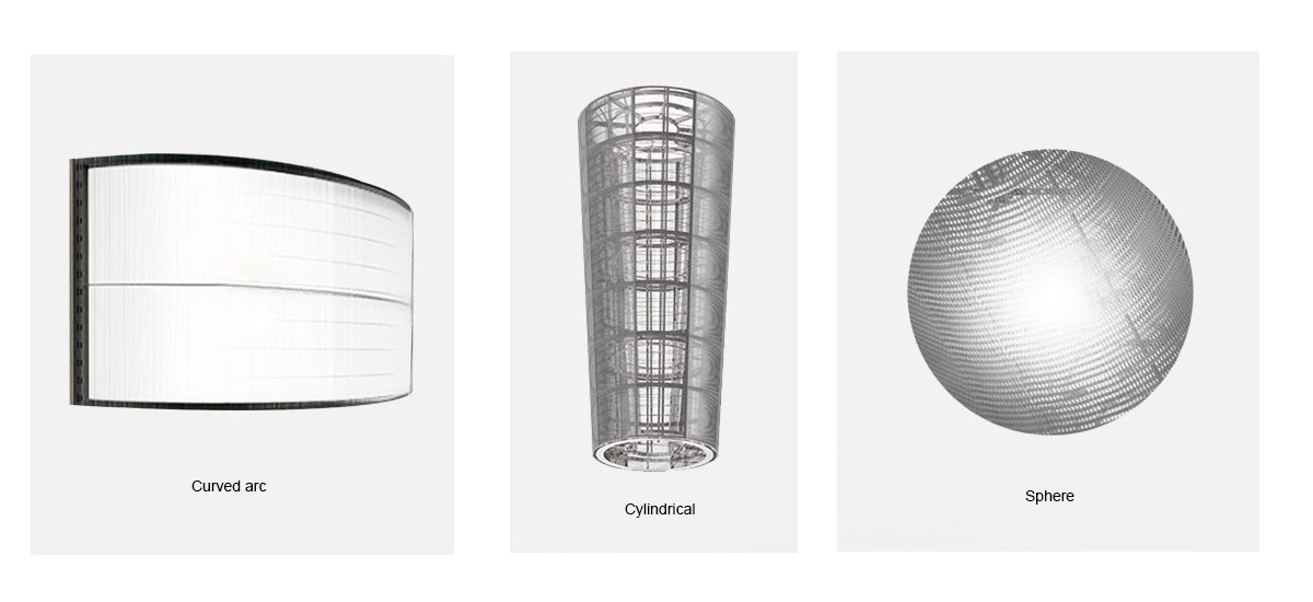 Flexible LED transparent screen series, screen structure and shaping can be customized to spherical, arc, cylindrical and so on, can be designed by engineers according to the actual project requirements, shaped screen appearance.